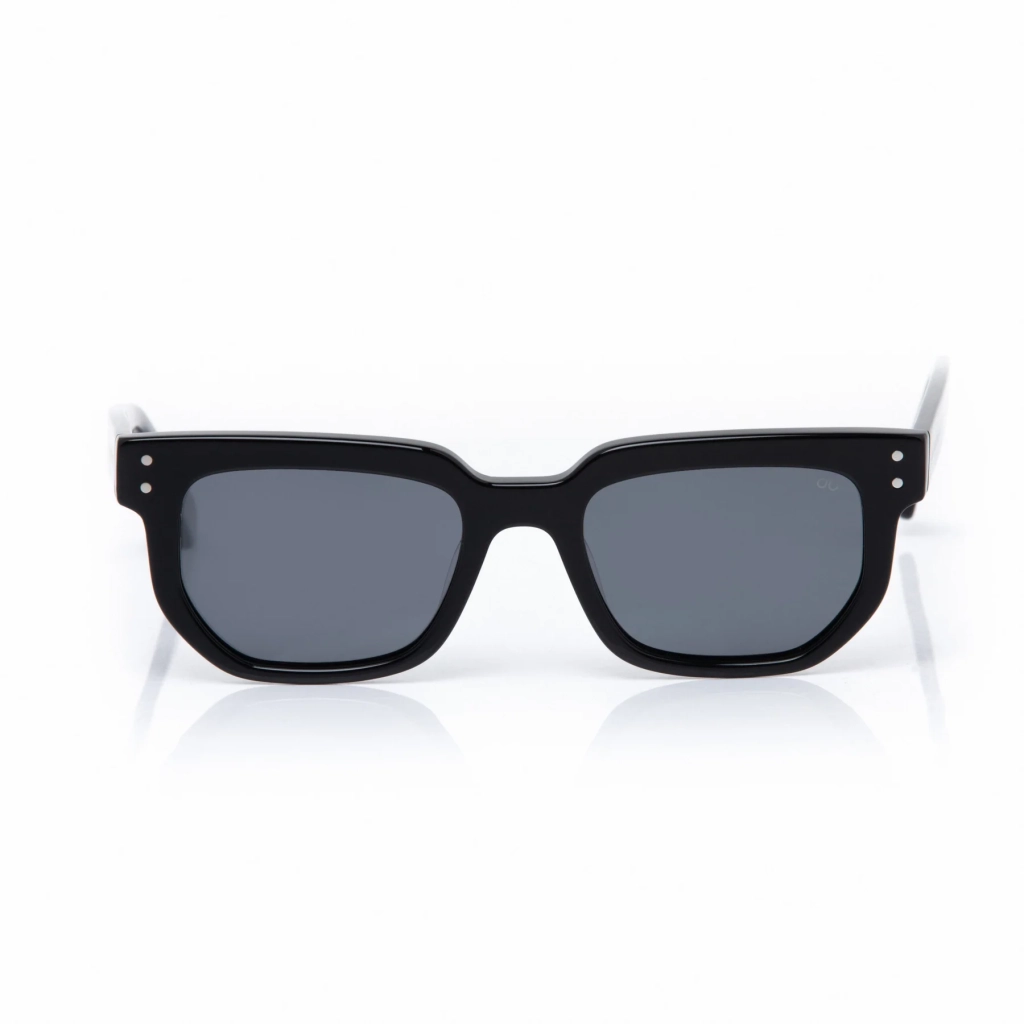 Lentes de sol fabricados en acetato con frente y patilla negro brillo. Cristal gris compacto con protección UV 400 y polarizado.