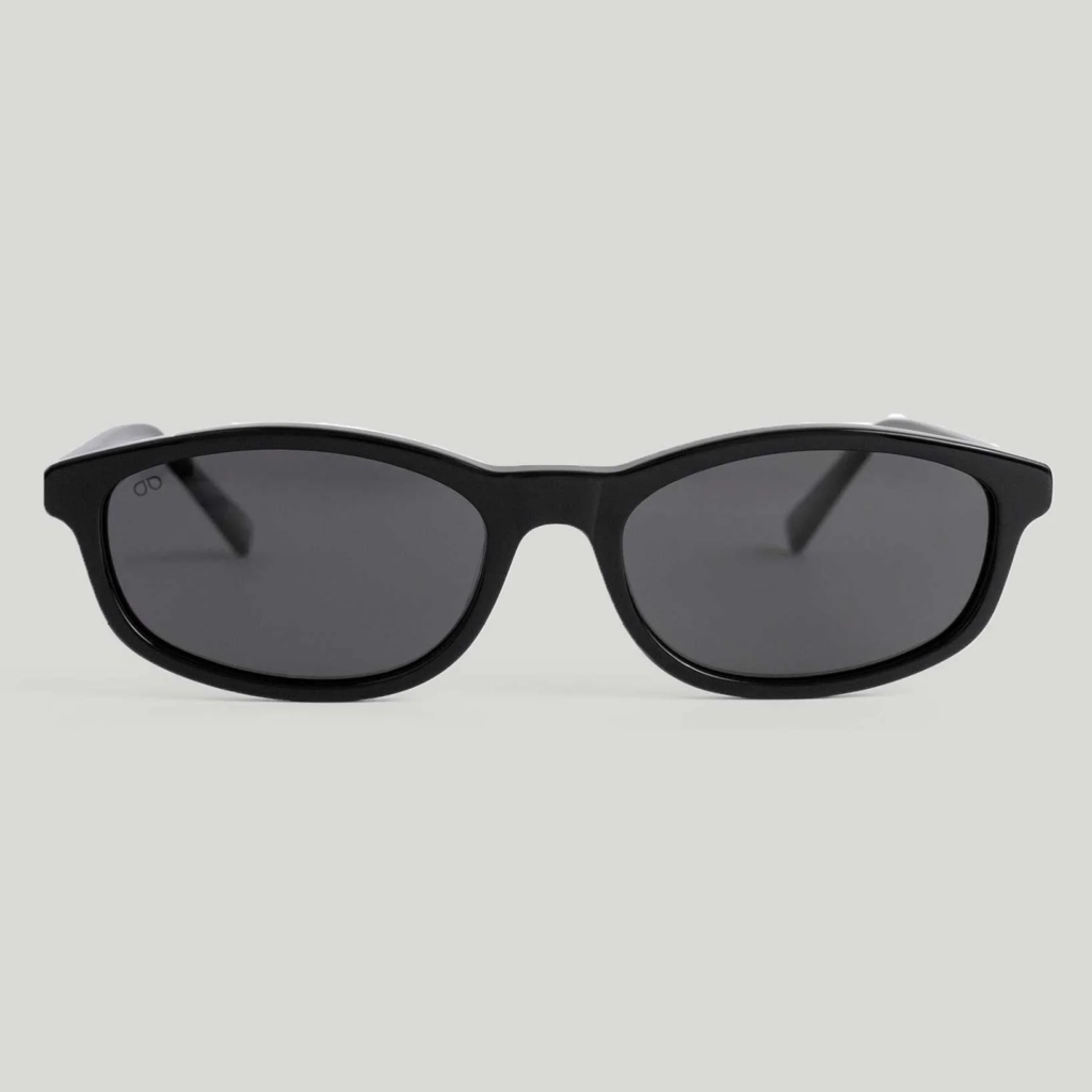 Lente de sol fabricado en acetato con frente y patillas negro brillo. Cristal gris compacto con protección UV400 y polarizado.