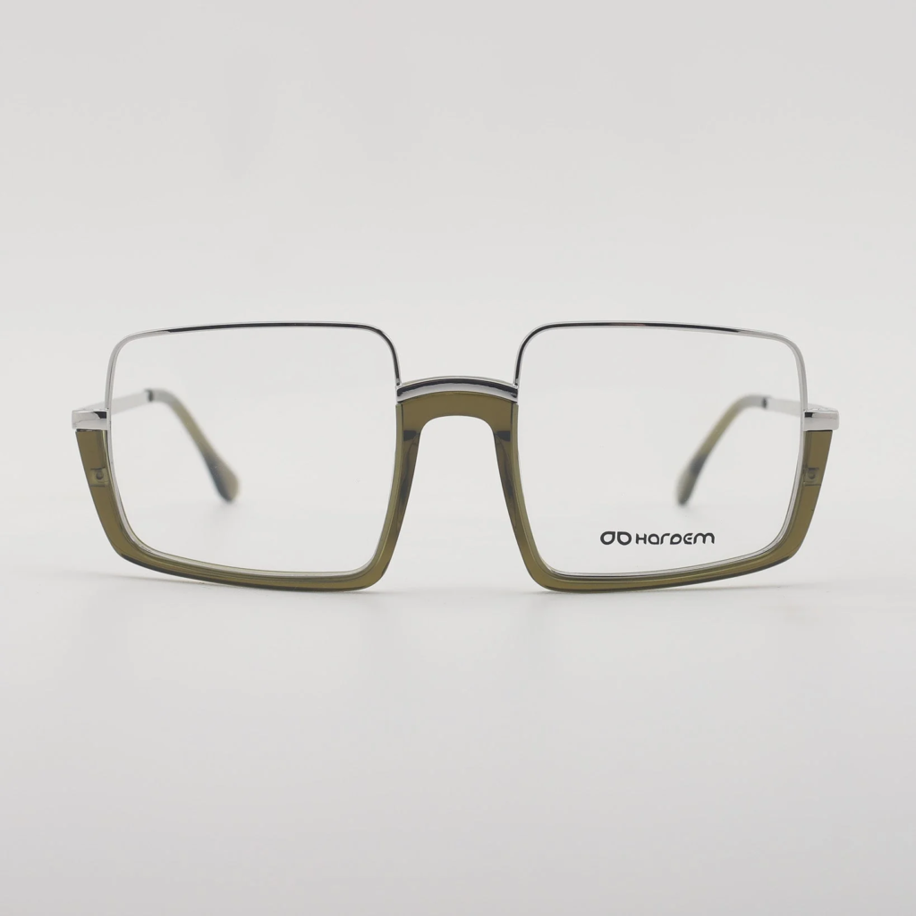 Lente fabricado en acetato y metal con frente verde translúcido brillo y patillas de metal plateado. Lentilla de presentación transparente.