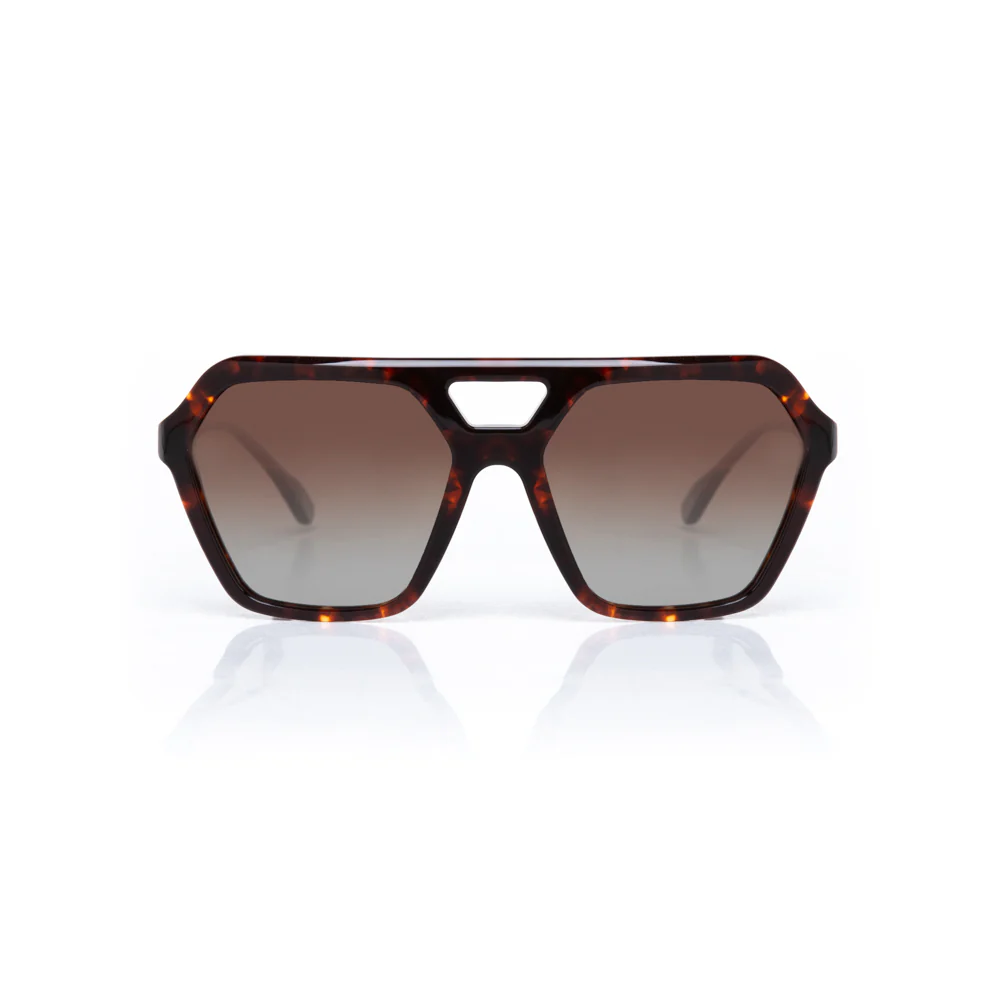 Lentes de sol fabricados en acetato con frente y patilla carey brillo. Cristal sepia degradé con protección UV 400 y polarizado.
