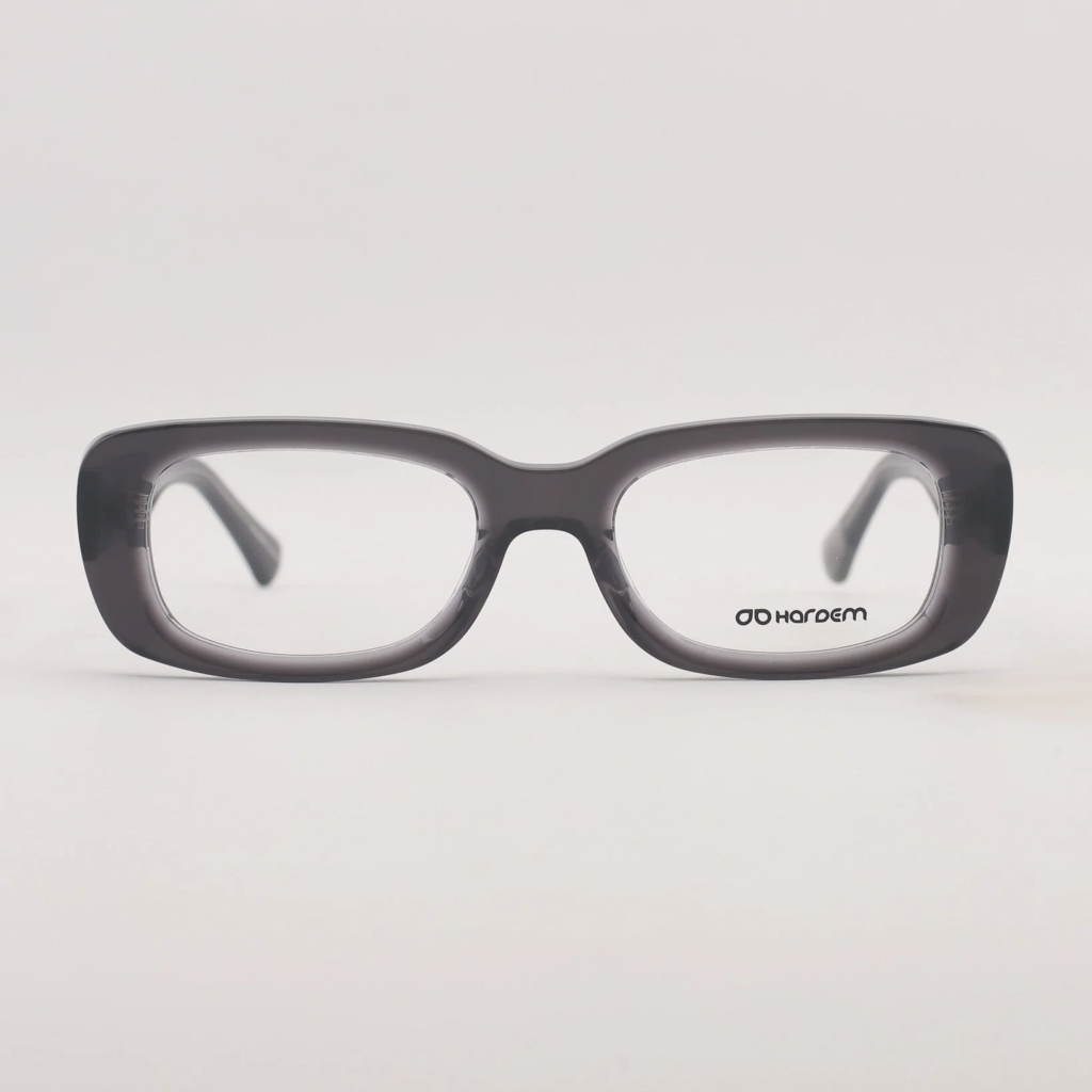 Lente fabricado en acetato con frente y patillas gris translúcido brillo. Lentilla de presentación transparente.